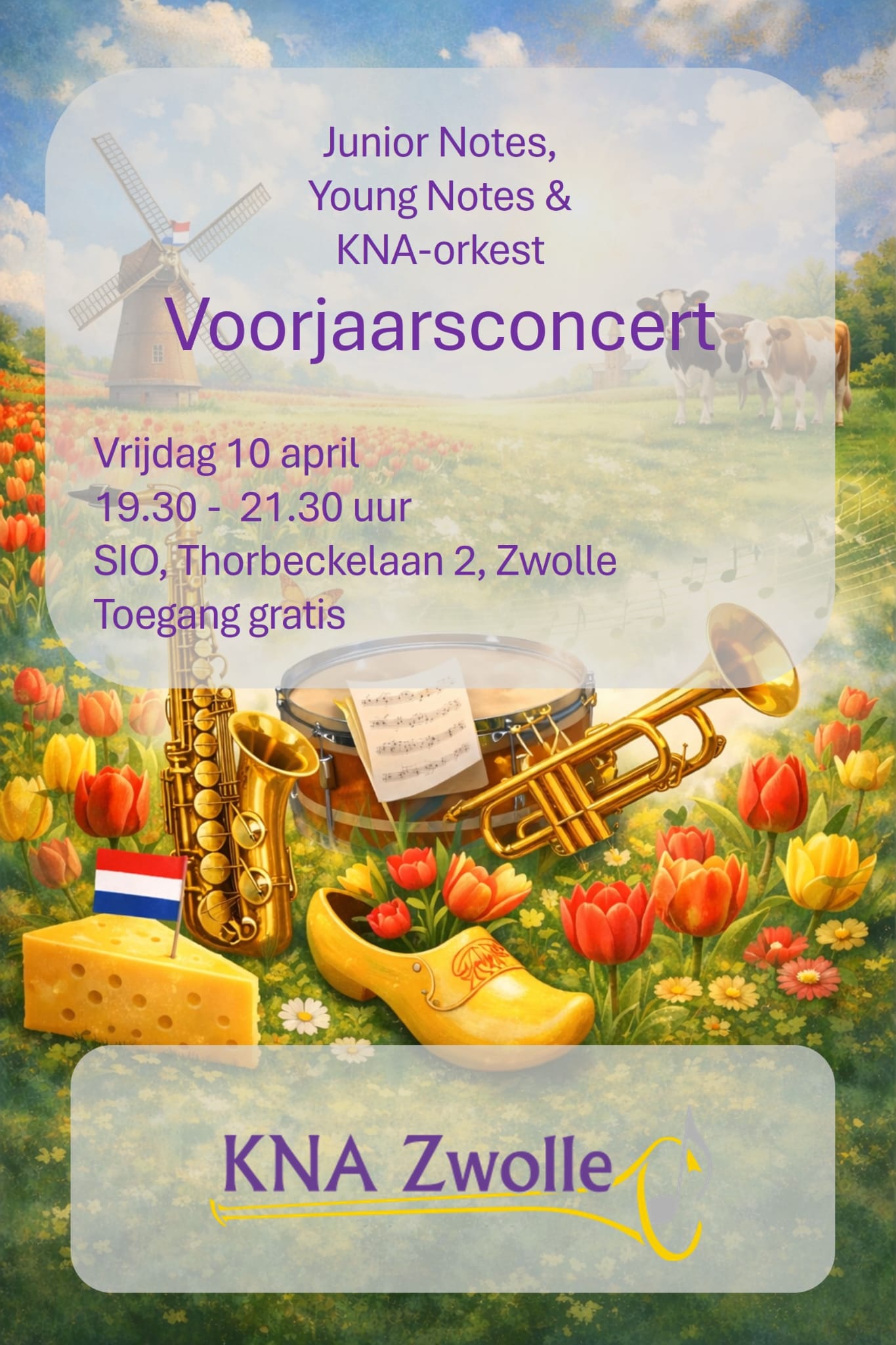 SIO Thorbeckelaan 2, Zwolle, NetherlandsVoorjaarsconcert Junior Notes, YoungNotes en KNA. Muziekvereniging KNA Zwolle bestaat inmiddels bijna 100 jaar en is destijds als Kunst Na Arbeid in Ittersum opgericht. De vereniging is en blijft springlevend. Het KNA Orkest speelt tijdens het concert een gevarieerd repertoire met moderne en lichte muziek met als thema 'Nederlands'. Tegenwoordig is er naast het KNA […]